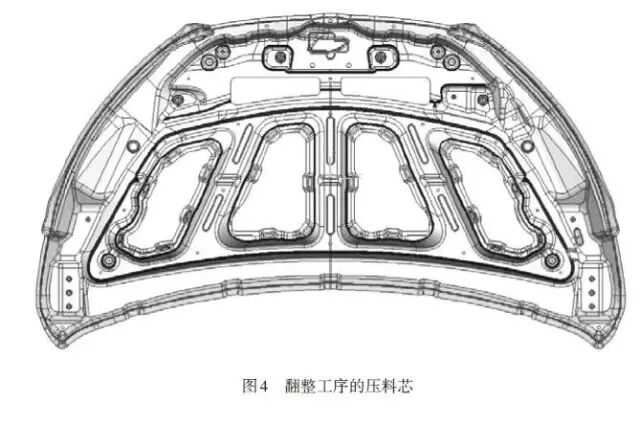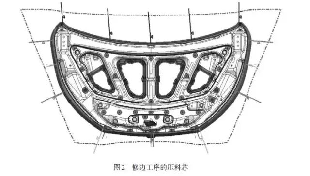 發蓋內板,車身覆蓋中較大的零件之一,具有材料薄、形狀復雜、多為空間曲面、結構尺寸較大等特點,成型性較其他小零件困難,為保證零件質量,在處理數模型面(以下簡稱模面)的時候對凹模、壓料芯、鑲塊等做強壓處理,對下模只做凹角讓空處理。簡單來說,模面處理就是改變凸凹模之間的間隙,使機床給模具施加的壓力在凸凹模表面進行重新分配,以提高制件的質量和模具的沖壓穩定性;同時,利用模面強壓也可以減少鉗工手修模具的時間、降低模具成本、縮短整體研合周期。在此,將比較成熟的后工序處理方案與大家進行探討。