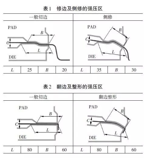 a.修邊強壓區20mm,側修可增大到30mm,如表1所示。