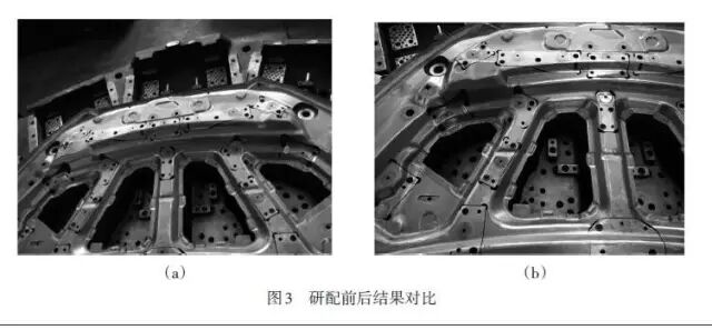我們廠由于模面偏差制造起步較晚,對于大面積避空方案還在探索中。當前偏差加工的方案是在模具制造過程中進行跟蹤和總結,將這種理念融入到設計中,從前期就減少模具的型面面積。通過對多個發蓋項目的后工序模具進行偏差加工,結果顯示鉗工型面有效區域研配的時間大大減少,模具的制造周期縮短。型面研配的面積減少了,人的參與少了,大面積打磨現象避免了,模具的品質也有了很大的提高。