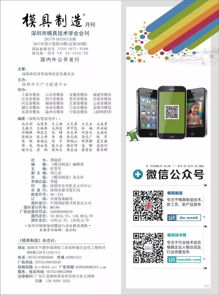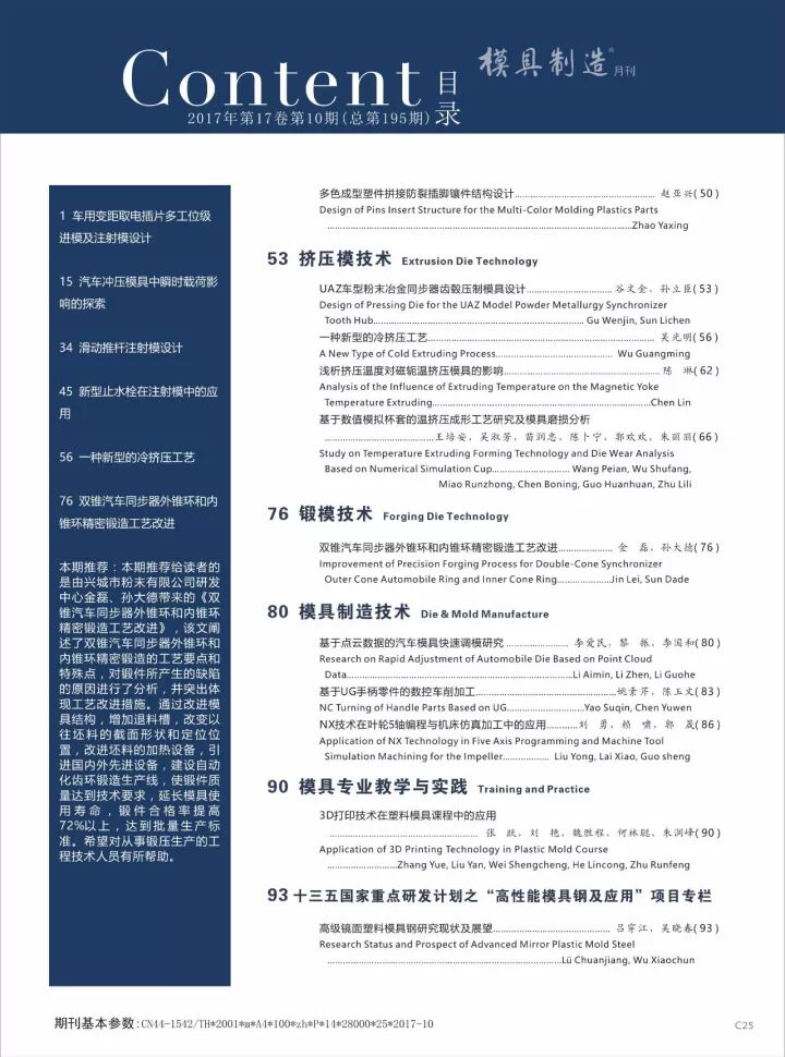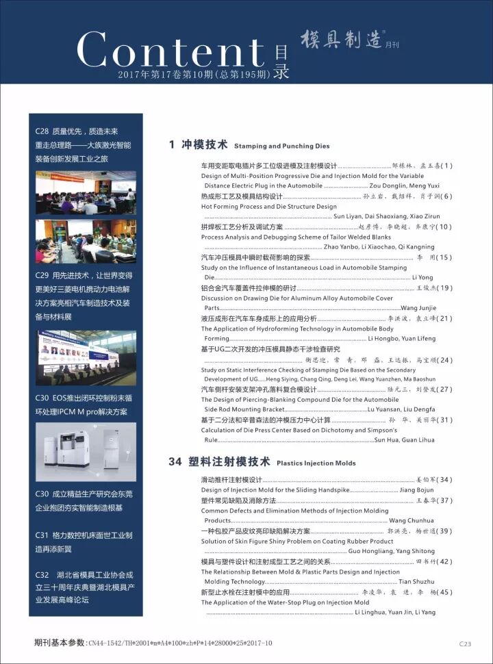 《模具制造》月刊是由模具制造雜志社出版發(fā)行的大型科技期刊,也是也是目前中國發(fā)行量最大且最具影響力的模具專業(yè)雜志。國際標準刊號:ISSN1671-3508,國內統(tǒng)一刊號:CN44-1542/TH,國外發(fā)行代號:M 8186,國內發(fā)行代號:46-234。